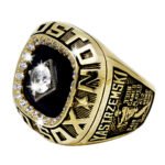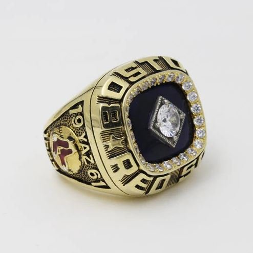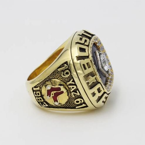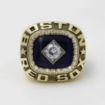 1. Material and Design: The championship ring is usually made of 24karat electroplated over blass and adorned with cubic zirconia and other gemstones. The design often incorporates the Red Sox’s team colors (red, navy blue, and white), the Red Sox’s logo (featuring the iconic “hanging socks” or “B”), and possibly baseball-related motifs such as bats or balls.