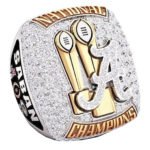 - Team Logo: The ring prominently features the Alabama Crimson Tide logo, likely in colored enamel or made from precious metal.